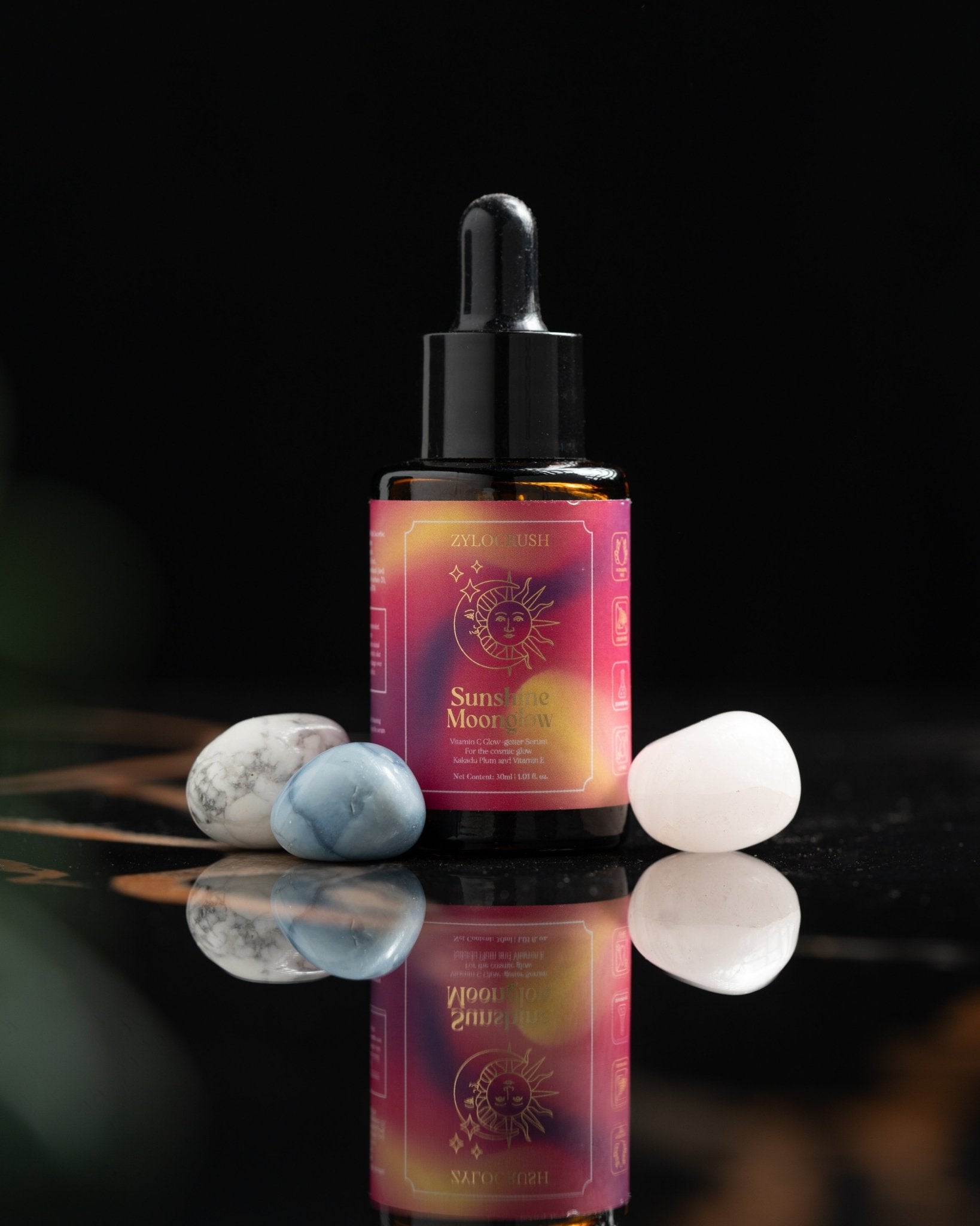 Just how the sun and moon dances across the cosmos, our Sunshine Moonglow serum illuminates your complexion with a celestial radiance. Dullness, uneven skin tone, and premature aging can leave your skin feeling out of sync with the universe. But fear not, for our cosmic elixir harnesses the power of Kakadu Plum, a natural source of vitamin C, to promote collagen synthesis and unveil a youthful, radiant glow.